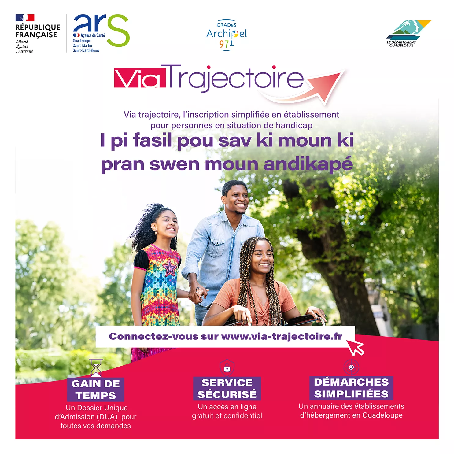 L'Agence Régionale de Santé de Guadeloupe, Saint-Martin et Saint-Barthélemy en partenariat avec le GRADeS Archipel 971, le Conseil Départemental et les Dispositifs d'Appui à la Coordination (DAC) annoncent l'ouverture au grand public de la plateforme en ligne Via-Trajectoire destinée à gérer les demandes d'orientation et d'admission des personnes âgées et des personnes en situation de handicap au sein des établissements médico-sociaux et sanitaires de notre territoire. Via-Trajectoire offre un parcours facilité, transparent et gratuit pour les usagers et leurs proches en demande d'établissement.